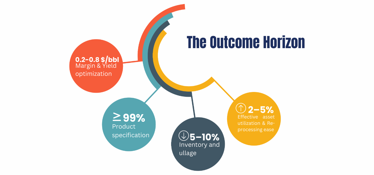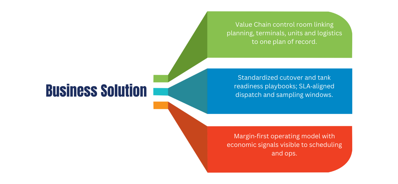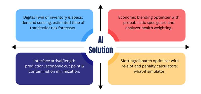 A unified Digital Twin mirrors terminal‑tank‑unit‑pipeline networks and aligns blending, tank cycles, unit severity and dispatch. AI advisors recommend clean cutovers, blending targets and slotting plans within hard safety/quality constraints, closing the loop from plan to execution.