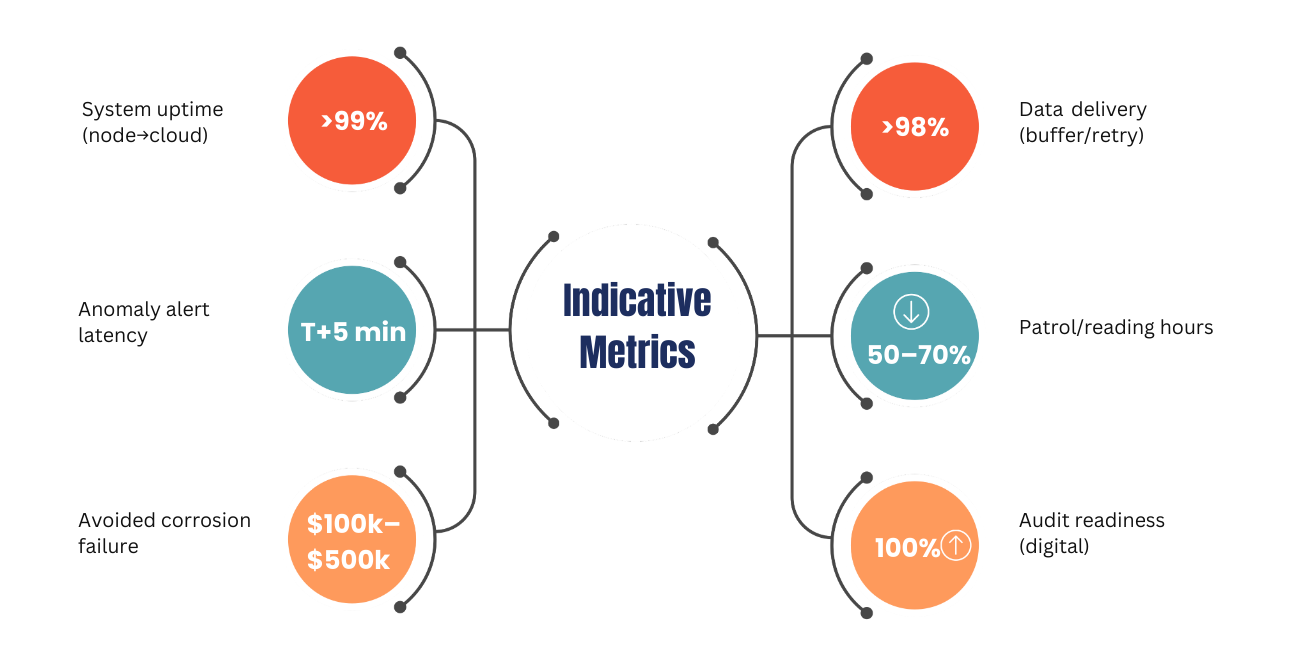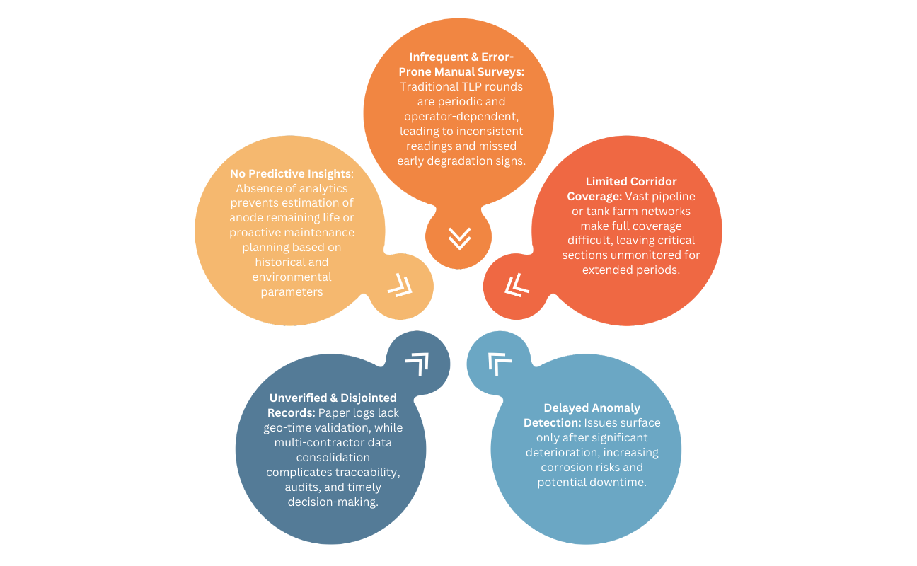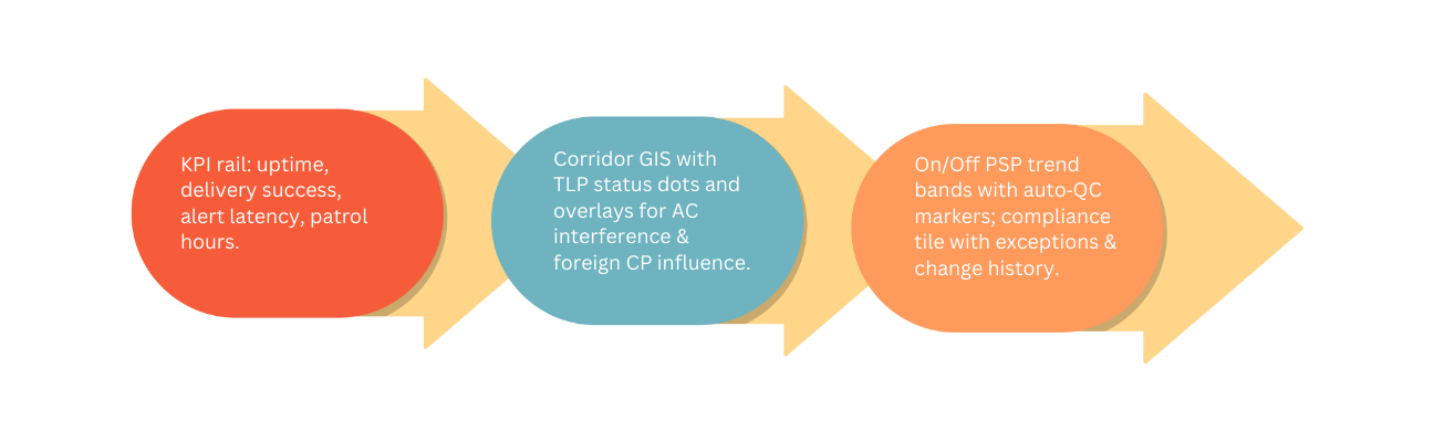 Smart nodes perform On/Off PSP and current density reads, transmit securely, and use AI to detect CP loss, stray DC and AC interference. GIS corridor view prioritizes patrols; regulator‑ready audit packs compress compliance effort