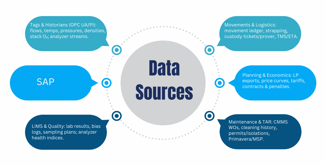 LIMS/analyzers (bias logs, drift), ERP/TMS, pricing feeds, LP exports (planning).