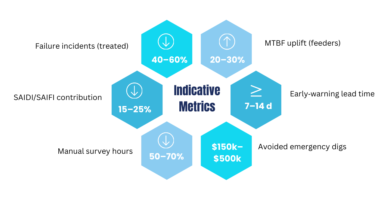 Hybrid discrete + distributed sensing with AI to detect hotspots, insulation degradation and third‑party interference. Delivers early warnings and ±10–30 m localization for targeted interventions and reduced SAIDI/SAIFI impact