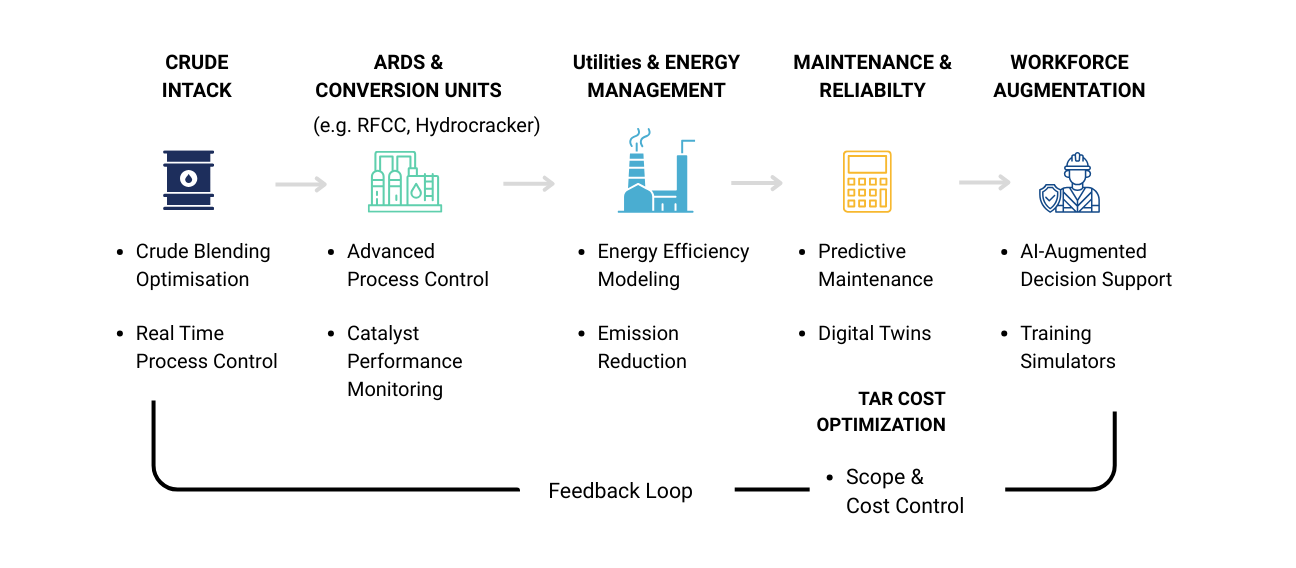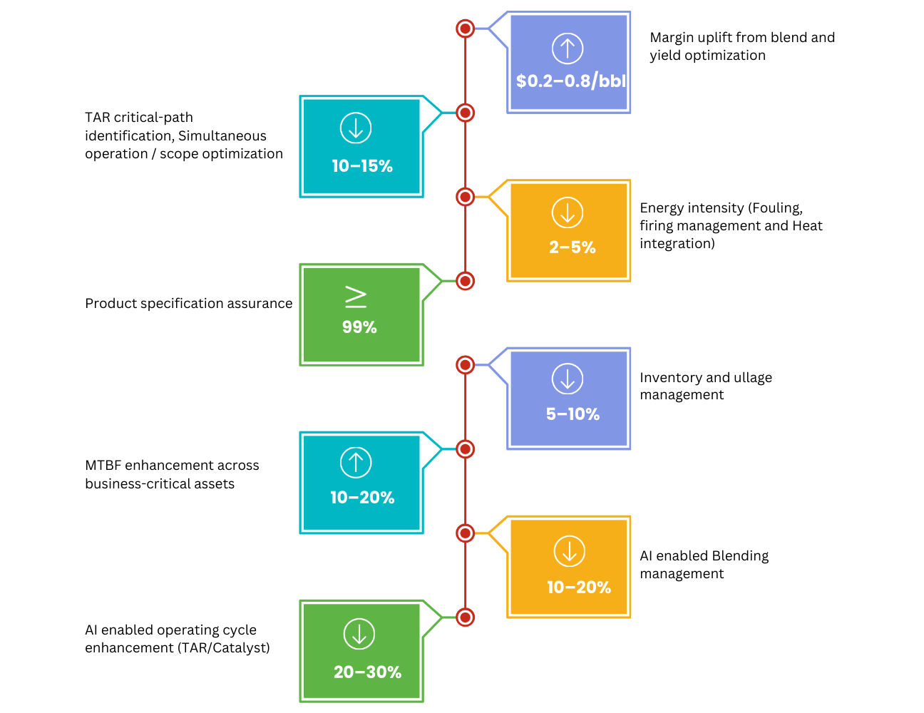Variable costs dominate day‑to‑day margin. A digital twin of steam/power/H₂ and quality ensures optimized values, routing and schedules minimize $/bbl without sacrificing throughput or specs—while remaining within hard safety envelopes.